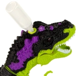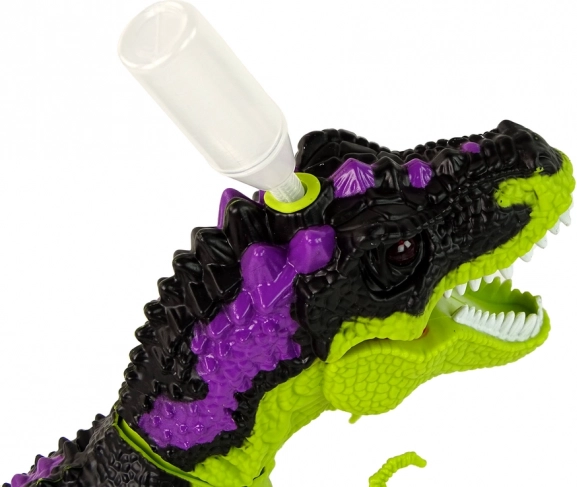 Op de kop van de dinosaurus zit een opening waarin je water kunt gieten met het meegeleverde flesje. Met de knop op de afstandsbediening (werkt op 2 AA-batterijen – niet inbegrepen) kun je stoom via zijn bek laten ontsnappen, wat eruitziet als vurige vlammen. In de set vind je ook een afstandsbediening in de vorm van een dinoblok, waarmee je zijn voorwaartse beweging kunt besturen.