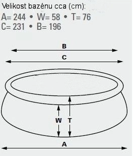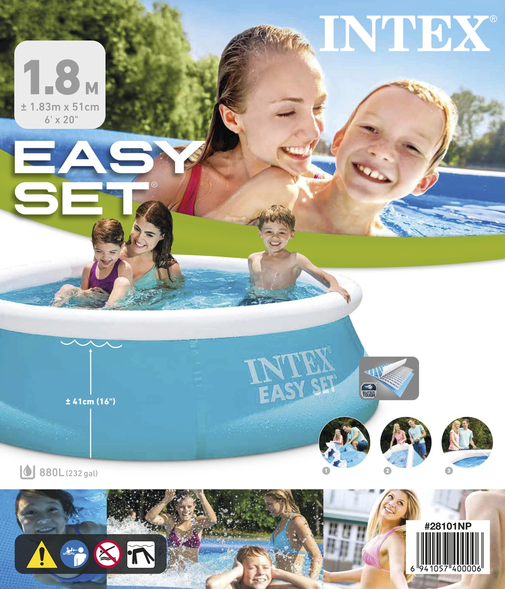 Zelfdragend zwembad. Afmetingen 183 cm (bovenomtrek 145 cm) x 51 cm. Waterniveau 41 cm. Capaciteit 900 l.