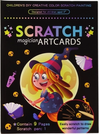 Ontdek creatieve pret met de set kraskaart-kleurplaten voor kinderen met heksenthema. Je hoeft alleen de zwarte laag weg te krassen met de houten stylus om kleurrijke illustraties te onthullen. Ideaal voor het stimuleren van fantasie en fijne motoriek, praktische afmetingen voor kinderhanden en een veilige uitvoering met CE-certificering.