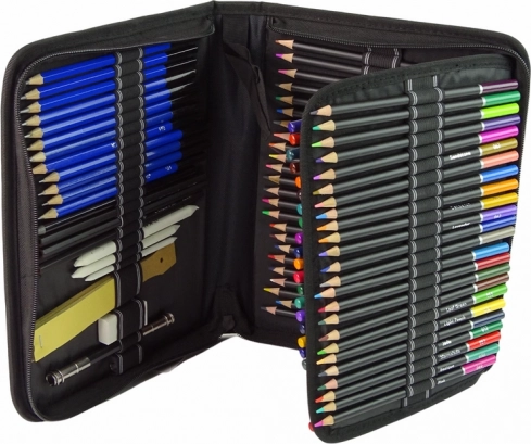 - 72 kleurpotloden; 12 grafietpotloden met verschillende hardheden; houtskool in 3 hardheden; 3 doezelaars + reiniger; gum; puntenslijper; potloodverlenger