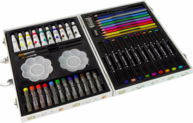 Dit veelzijdige kunstkoffertje is het perfecte cadeau voor kinderen die van kleuren en fantasie houden. Dankzij de overzichtelijk gerangschikte materialen hebben kleine kunstenaars alles bij de hand – ze kunnen tekenen, schilderen en tinten mengen. De praktische uitvoering met metalen handvat en sluiting zorgt voor eenvoudig dragen en veilig opbergen van alle materialen.