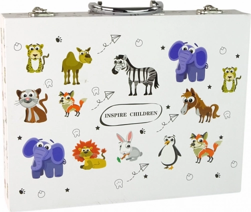 De set bevat 10 tubes verf (6 ml), 2 penselen voor vlakken en contouren, 2 kunststof paletten in bloemvorm, 12 oliepastels, 10 klassieke kleurpotloden, 10 stiften met dubbele punt, een gum, een puntenslijper en een kleurboek met 20 dierenafbeeldingen. Alles is klaar voor direct creatief plezier, thuis, op vakantie of op school.