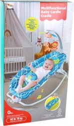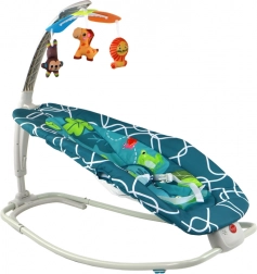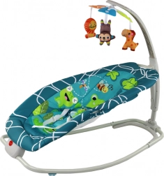 Dit product bevat een witte veiligheidsgordel om de veiligheid van uw kind te waarborgen. Werkt op twee 1,5 V batterijen (niet inbegrepen) en biedt verschillende entertainmentopties, inclusief muziek en trillingen, die het kind helpen ontspannen en in slaap te vallen. De kleurcombinatie van groen en blauw creëert een vriendelijke omgeving. De ligstoel kan ook worden omgevormd tot een stabiele zitplaats door de witte pootjes uit te klappen.