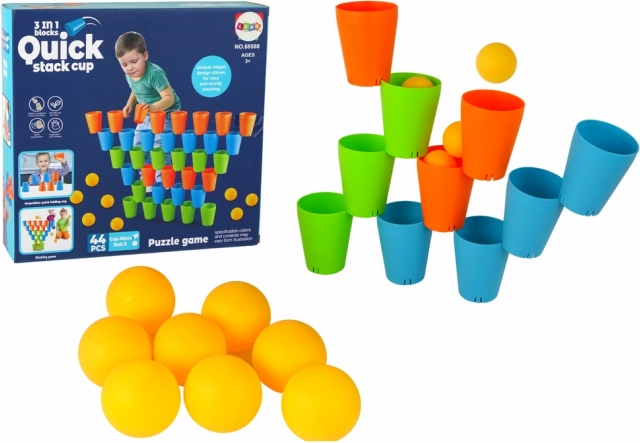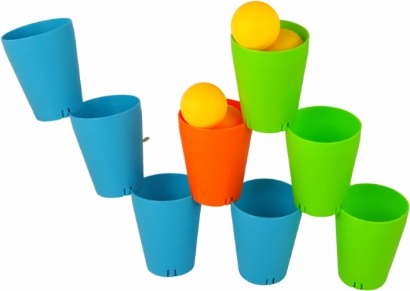 De set bevat kelken in drie kleuren: oranje, groen en blauw met gele ballen voor speels rangschikken en stapelen.
