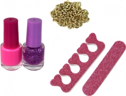 Twee nagellakken in opvallende kleuren, een tenenseparator en een nagelvijl vormen een minisalon voor kleine beautyfans. Gemakkelijk en leuk nagels versieren, altijd en overal.