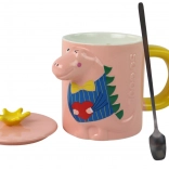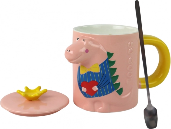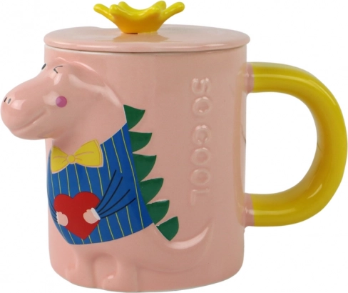 Deze stijlvolle keramische mok combineert functionaliteit met een speels design. Het roze lichaam met geel oor wordt aangevuld door een deksel met een gele kroon, dat je drankje beschermt en de originele look compleet maakt. Het 3D-reliëf met dinosaurus zorgt bij elke slok voor plezier – ideaal voor koffie, thee en chocolademelk.