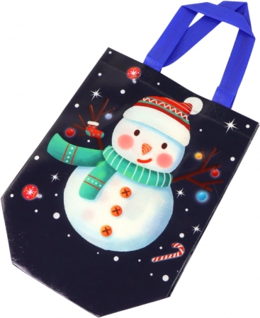 Verfraai je cadeaus met een elegante donkere tas met een vrolijke sneeuwpop. Deze textielen winkel-/cadeautas met stevige blauwe hengsels en duurzaam materiaal is ideaal voor stijlvol overhandigen van cadeaus en voor lichte boodschappen in de feestperiode.