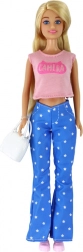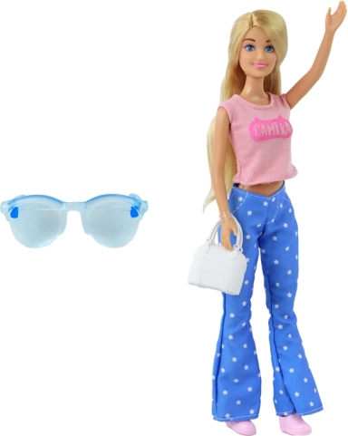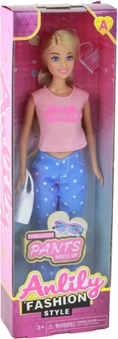 Stijlvolle pop ANLILY met lang blond haar, gekleed in een roze top, blauwe broek met sterretjes en roze sneakers. Inclusief een witte handtas en blauwe bril voor creatief stylen. Formaat van de pop 30 × 7 × 5 cm, verpakking 32 × 11 × 5 cm. Certificering CE, norm EN71, geschikt vanaf 3 jaar.