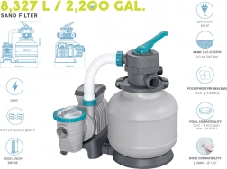 Deze pomp met een capaciteit van 8327 liter per uur is geschikt voor zwembaden met een inhoud van 1.100 tot 54.500 liter. Voor gebruik is nr. 20 silicasand (0,45–0,85 mm) of de zeer efficiënte filterkogels POLYSPHERE vereist.