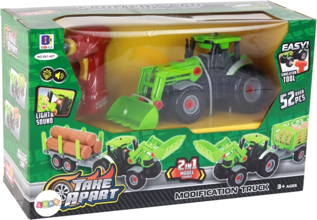 Met de meegeleverde onderdelen kunnen kinderen de tractor en aanhanger zelf in- en uit elkaar zetten – ideaal voor de ontwikkeling van technisch inzicht.