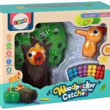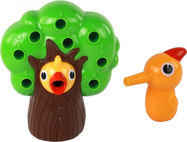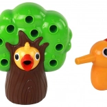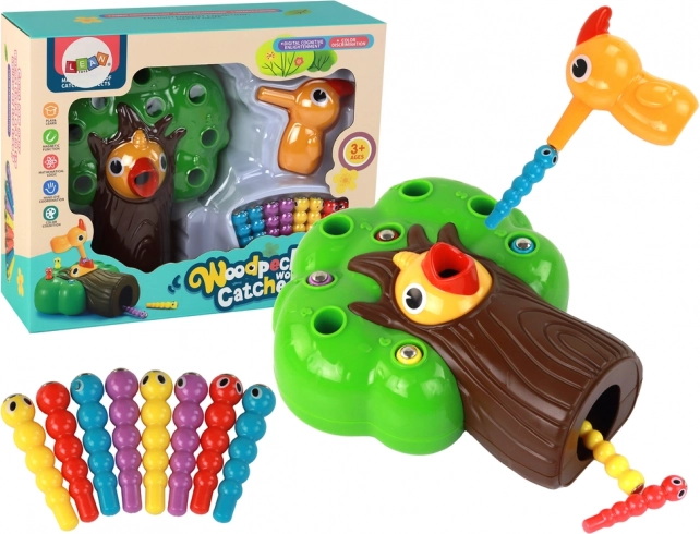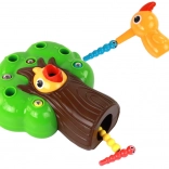 De set bevat een boom met openingen, een magnetisch vogeltje om de wormpjes te pakken, gekleurde wormpjes en een kuikentje/nest om te “voeren”.
