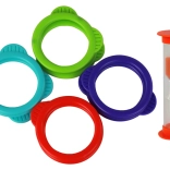 De set bevat ringen in vier kleuren en een zandloper voor een snel wedstrijdrondje. Stel de tijd in en probeer zoveel mogelijk ringen te plaatsen voordat het zand is doorgelopen.