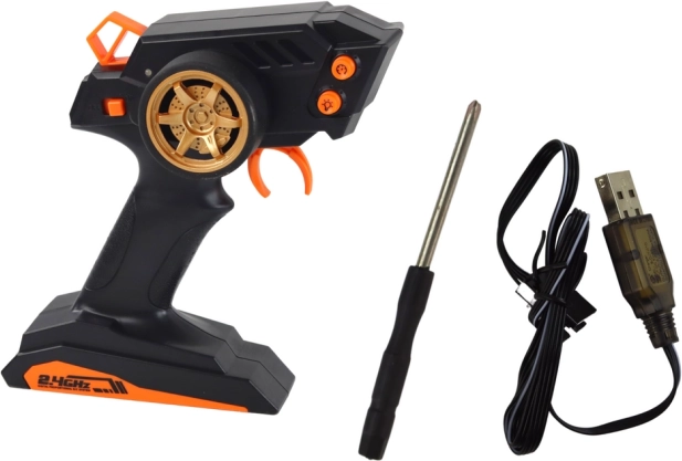 LED-verlichting accentueert het rijden in de schemering. In de verpakking vind je een 7,4 V-accu en oplader – je hoeft alleen 2× AA-batterijen in de zender te plaatsen.