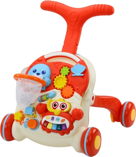 De voorkant van de duwwagen bestaat uit een afneembaar paneel vol kleurrijke en interactieve elementen die aanzetten tot ontdekken. Beweegbare onderdelen draaien en bewegen, stimuleren de zintuigen en ontwikkelen de cognitieve vaardigheden van het kind. Daarnaast is er een klein toetsenbordje in de vorm van een schattige krab dat geluiden maakt, melodieën afspeelt en waarvan de LED-lampjes op het ritme van de muziek knipperen – zo krijgt je kind onvergetelijke ervaringen en plezier.