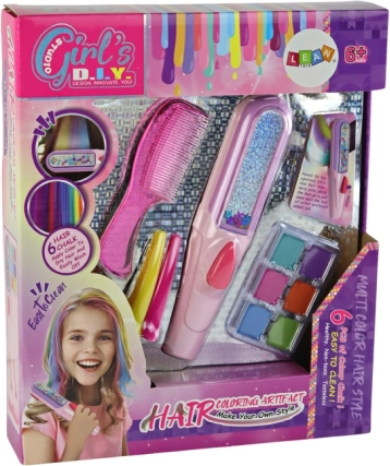 In de set vind je diverse tools, waaronder een speciaal apparaat dat zorgeloos aanbrengen van kleuren op het haar mogelijk maakt. Elk onderdeel is ontworpen met oog voor kleine handjes en een grote fantasie.