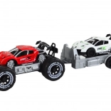 Achter de auto is een aanhanger gekoppeld met daarop een kleinere witte sportwagen, klaar voor nieuwe uitdagingen. Wat deze set echter echt uitzonderlijk maakt, is de buitengewone functionaliteit. De aanhanger kan op elk moment van de rode auto worden losgekoppeld, waardoor je de mogelijkheid krijgt om nog complexere verhalen te creëren en de fantasie van je kind te stimuleren.