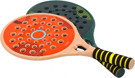 .De handgrepen van de padelrackets in contrasterend zwart en geel zijn gemaakt van zacht kunststof, wat zorgt voor een comfortabele grip en extra comfort. De afmetingen van deze rackets zijn 46 cm x 22 cm x 3 cm, wat stabiliteit en precisie tijdens het spel garandeert.