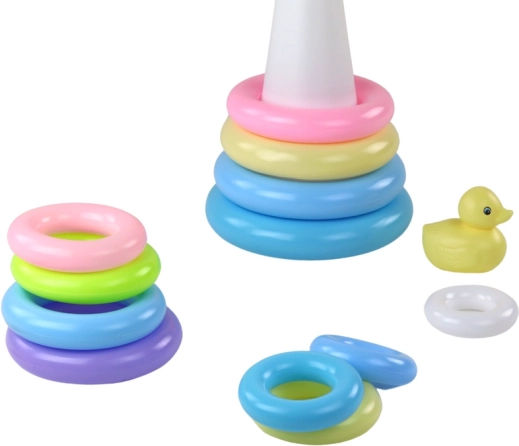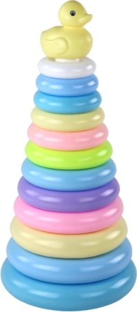 Deze educatieve stapelpiramide in pastelkleuren motiveert kinderen om 12 ringen van groot naar klein te sorteren en te rijgen. Spelenderwijs leren ondersteunt de ontwikkeling van de fijne motoriek, oog–handcoördinatie, geduld en verbeeldingskracht. Het bovenste deel is versierd met een schattig eendje dat uitnodigt tot meer spel.