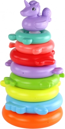 Kinderen stapelen de ringen van groot naar klein, waardoor ze spelenderwijs logisch denken, kleurenherkenning en sorteren ontwikkelen. De eenhoorn bovenop geeft het spel een magisch tintje.