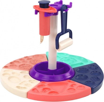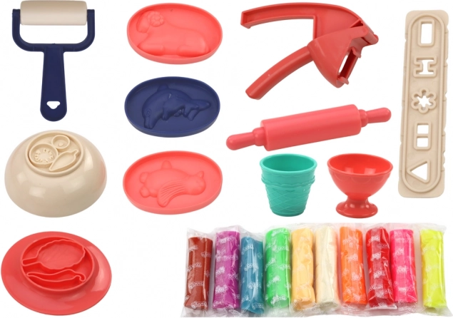 De set bevat een keukenpers, 2 deegrollers, kommen, bord en bekertjes en diverse vormpjes voor ijs, fruit, groenten en decoraties. De set stimuleert de verbeeldingskracht, traint de fijne motoriek en leert kinderen creatief spelen zonder rommel.