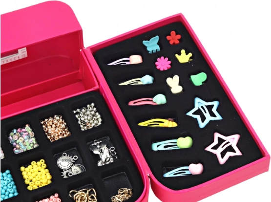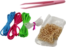 Dankzij de koordjes in verschillende kleuren (roze, groen, blauw), de visdraad en accessoires kunnen kinderen sieraden ontwerpen voor diverse gelegenheden. Er zijn ook schattige haarelastiekjes en haarspeldjes en clip-on oorbellen – geschikt voor kinderen zonder gaatjes.