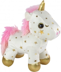 De witte eenhoorn met gouden sterretjes, roze manen en gouden hoeven is zijdezacht om aan te raken en nodigt uit om te knuffelen.