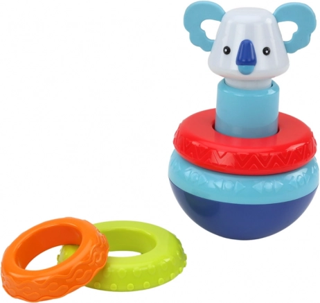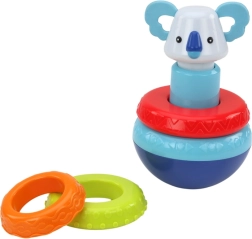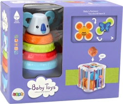 De set bevat drie uiteenlopende onderdelen, die elk unieke ervaringen en uitdagingen voor het kind bieden. De toren met koala-wieltjes helpt niet alleen de fijne motoriek te ontwikkelen door de wieltjes op de juiste plekken te plaatsen, maar zorgt ook voor plezier dankzij de schommelende beweging van de koala.