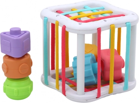 Het sensorische blok dat met elastische bandjes is verbonden, is een ander fascinerend speeltje dat de zintuigen van de peuter prikkelt. Het doorrijgen van het blok met elastieken kan in het begin een uitdagende taak lijken, maar het is een geweldige kans om denken, combineren en creatief probleemoplossen te ontwikkelen, aangepast aan het ontwikkelingsniveau van je peuter.