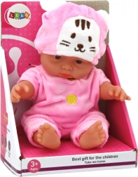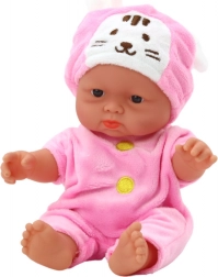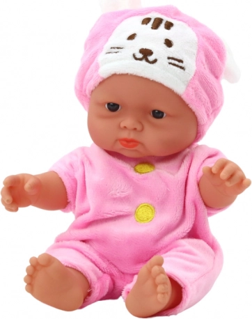 Een schattige kleine babypop is de ideale speelkameraad voor kinderen. Ze draagt een roze outfit met gele knoopjes, een lief mutsje met oortjes als een konijntje en heeft bewegende armpjes, beentjes en een draaibaar hoofdje. Stimuleert perfect de fantasie en de fijne motoriek van kinderen.