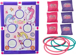 Het spel bestaat uit een stevige, kleurrijke speelplank versierd met afbeeldingen van schattige eenhoorns, die niet alleen het spel ondersteunt, maar ook de verbeelding van kinderen prikkelt. De speelplank bevat een puntensysteem dat een element van competitie en spanning toevoegt. De set omvat speciaal ontworpen werpzake n voor stabiele vlucht en nauwkeurige treffers en kleurrijke ringen.