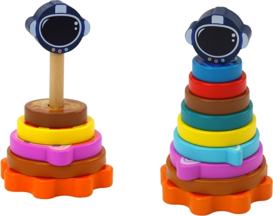 De houten stapelpiramide met ruimtethema combineert spel en leren. Kinderen sorteren de gekleurde ringen – “planeten” – op grootte en oefenen zo vergelijken, oriëntatie en geduld. Het laatste onderdeel in de vorm van een ruimtehelm geeft extra plezier bij het afronden van de taak.