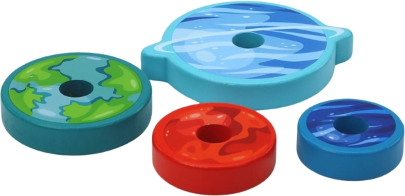 Kleurige houten “planeten” in verschillende groottes leren sorteren, vergelijken en kleuren herkennen.
