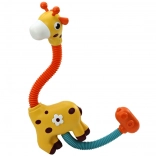 De giraffe heeft een 360° draaibaar nekgedeelte, grote zuignappen voor een stevige bevestiging op gladde oppervlakken en eenvoudige bediening met een knop. De constructie en kleuren zijn kindvriendelijk, het speeltje is licht en makkelijk te monteren. Voldoet aan de normen CE en EN71.