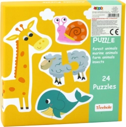De doos vol kinderpuzzels van Treehole biedt illustraties van dieren zoals giraffe, slak, schaap en walvis. Bevat 24 puzzels met thema’s van bos-, zee- en boerderijdieren en insecten.