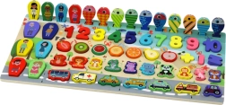 De set bevat driedimensionale houten stukjes die het kind kan toewijzen aan de overeenkomstige plekken op de plaat. Dit is niet alleen leuk, maar ontwikkelt ook de fijne motoriek en oog-handcoördinatie.