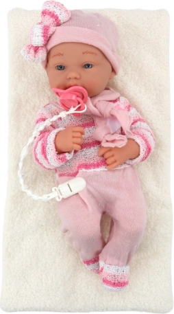 Schattige babypop in een roze outfit die elke kleine verzorger zal blij maken. Heeft bewegende armen en benen, realistische gelaatsdetails en praktisch accessoires waaronder een fopspeen aan een koordje en een heerlijk zacht dekentje. Gemaakt van veilige materialen, geschikt vanaf 18 maanden.