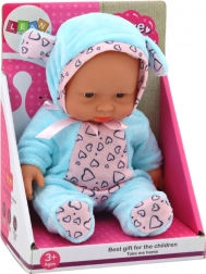 Schattige kleine pop – baby in een blauwe outfit met hartjes en een muts met oortjes zal elk meisje blij maken. Heeft bewegende armen en benen, een draaibaar hoofd en dankzij de compacte afmetingen van 21 × 14 × 6,5 cm is hij geschikt voor op reis en in het kinderbedje. Het speelgoed is CE-gecertificeerd en voldoet aan de EN71-norm, geschikt vanaf 3 jaar.