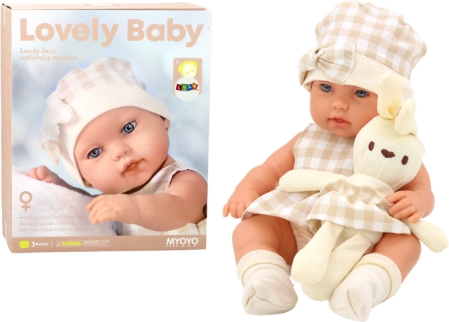 Een schattige baby-pop in een zachte draagzak met een pluchen konijntje zal elk kind blij maken. Ze heeft een realistische uitstraling, bewegende armen en benen, is gekleed in een beige-witte ruit en nodigt uit tot creatief en empathisch spel. De praktische draagzak zorgt voor gemakkelijk dragen en comfort tijdens het spelen.