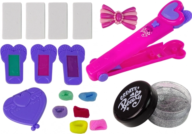 De set bevat krijtjes in de kleuren roze, groen en paars, een kinder-stijltang voor applicatie, 6 elastiekjes, 3 wattenschijfjes om de krijt te verwijderen, een clip, een kam en een spiegeltje.