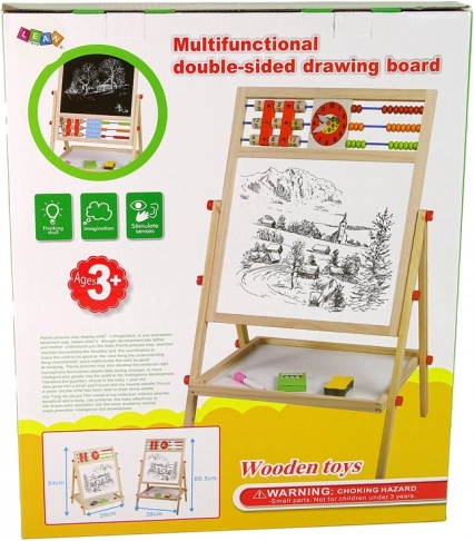 .Dit dubbelzijdige educatieve tekenbord met telraam, klok en alfabet is een uitstekende ontwikkelingshulp voor de allerkleinsten. Het is gemaakt van massief hout en zorgt voor duurzaamheid en veiligheid tijdens het spelen. Dankzij de draaibare constructie kunnen twee verschillende oppervlakken worden gebruikt: een met een zwart materiaal, ideaal om met krijt op te tekenen, en een wit oppervlak, ideaal voor stiften.