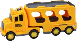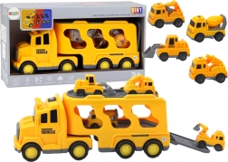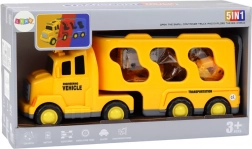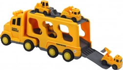 Gele vrachtwagen voor kleine liefhebbers van motorvoertuigen en de bouwsector. Inclusief een grote kleurrijke transporter met opbergruimte voor kleinere bouwvoertuigen zoals een graafmachine of betonmixer.