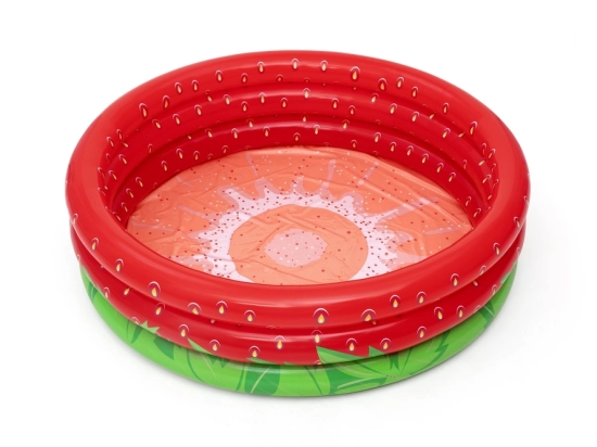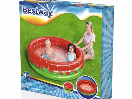 Het opblaasbare BESTWAY-zwembad met vrolijk aardbeienontwerp biedt kinderen aangename verkoeling tijdens warme dagen. Dankzij de compacte afmetingen is het ideaal voor tuin, terras en binnenplaats, en de driekamerconstructie zorgt voor stabiliteit en zachte ondersteuning voor comfortabel spelen.