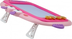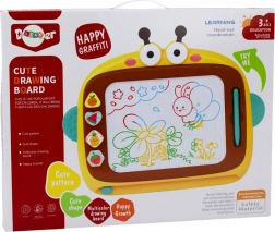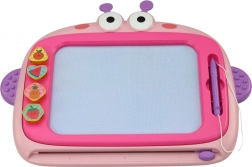 Het magnetische bord is ideaal voor eerste tekeningen, schrijven en eenvoudig leren. Onder het scherm zitten metalen deeltjes die zich bij aanraking van de magnetische pen vormen tot afbeeldingen in vier kleuren (blauw, geel, groen, rood). Je hoeft alleen de wis-schuif te bewegen en het oppervlak is weer schoon – zonder papier en rommel.