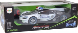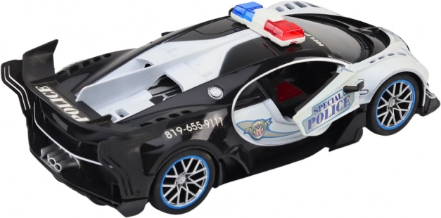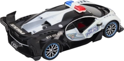 Ga de actie in met de witte RC-politieauto die een sportwagen natuurgetrouw nabootst, met authentieke bestickering en zwaailicht. De controller met pookjes maakt vloeiend sturen, versnellen en remmen mogelijk, waardoor de rit maximaal realistisch aanvoelt. Lichteffecten versterken de sfeer van politieachtervolgingen.
