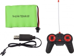 De dual-joystickcontroller zorgt voor vloeiend sturen, accelereren en remmen. In de verpakking vind je ook een 6 V-accu en een USB-oplader.