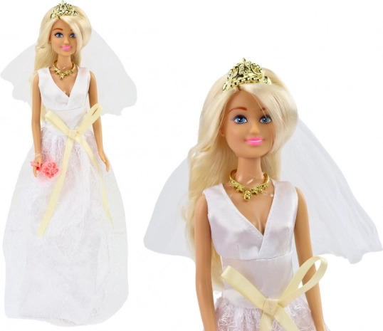 De pop houdt een boeket roze rozen vast, wat haar authentieke uitstraling nog verder versterkt. Haar lange blonde haar is netjes gekamd en bedekt met een sluier die zachtjes over haar rug valt.
