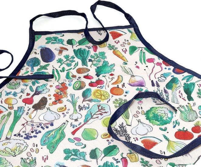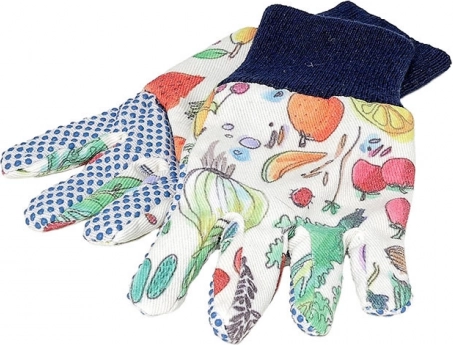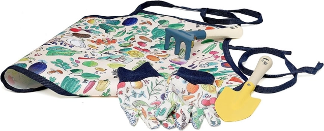 Bonte patronen op de schort en handschoenen maken tuinieren tot een vrolijke activiteit.