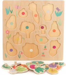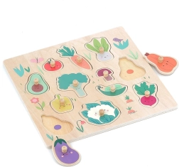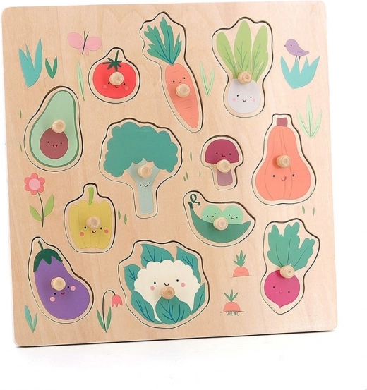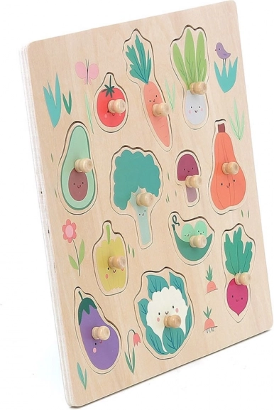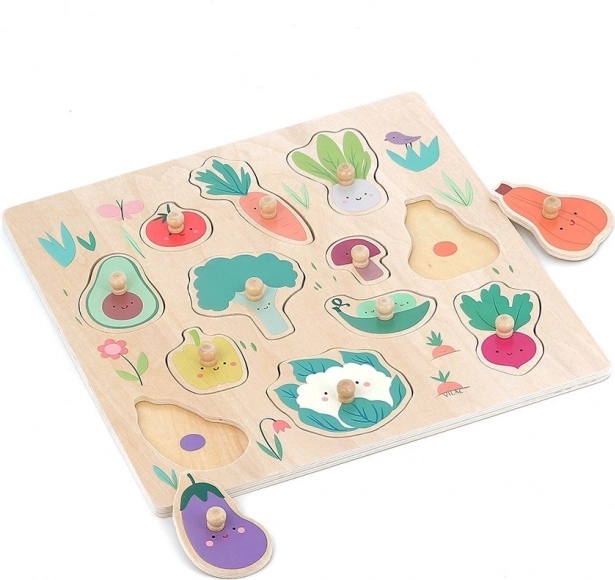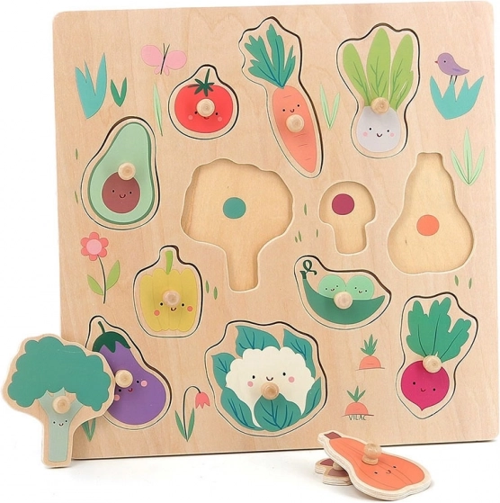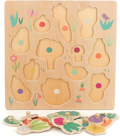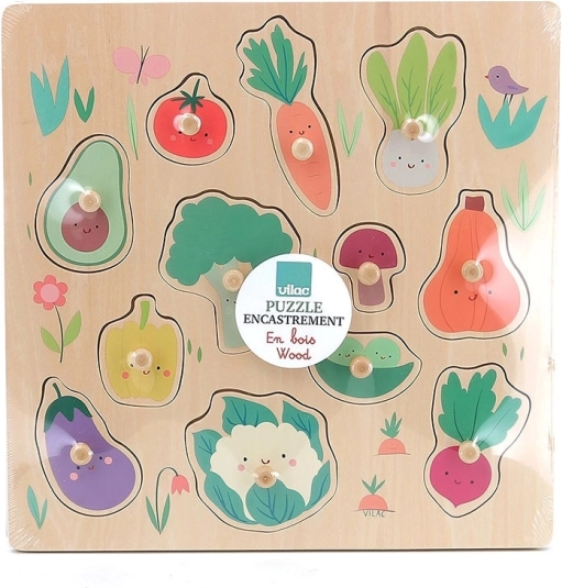 Vilac puzzel Groenten met knopjes is een ideale speelgoedset voor kinderen die plezier met leren combineert. Met behulp van houten knopjes plaatsen ze alle stukjes eenvoudig en ontwikkelen ze fijne motoriek en cognitieve vaardigheden.