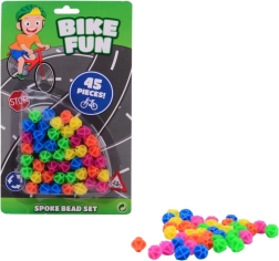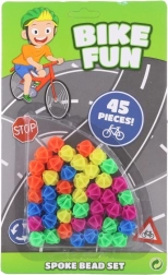 Kleurige decoratieve kralen voor de fiets. Materiaal: kunststof. De verpakking bevat 45 kralen. Na installatie bewegen ze omhoog en omlaag met de beweging van het wiel. Het product is geen speelgoed