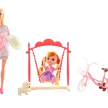 Ontdek de grote poppenset met accessoires die uren creatieve speelpret biedt. De set bevat een beweegbare pop van 30 cm, een kleinere pop van 16 cm, een roze auto van 33 cm, een scooter van 30 cm, een fiets van 17 cm, een schommel, een hondje en stijlvolle accessoires zoals een hoed, helm en tas. Gemaakt van hoogwaardig plastic, verpakt in een cadeauverpakking. Leeftijd 3+.
